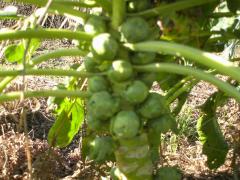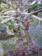 Les choux de Bruxelles ont été pas mal attaqués par les altises au début de leur croissance. Ils ont eu des limaces aussi mais ni les altises, ni les limaces semblent les avoir beaucoup dérangés. Je les ai pulvérisés avec un infusion d'ail quelque fois et ça a marché. Ils ont pas eu des maladies. Les feuilles rouges pour lesquelles je m'inquiète dans le blog sont tombées et pour le moment ils poussent tranquillement dans son petit coin sans souci. On peut commencer à les manger quand on veut maintenant. Certaines plantes ont les choux un peu mous mais le plus part semblent très fermes et bons. Ils poussent un peu inégalement et ils sont pas devenus très grands. Le gel ne les dérange pas du tout. J'ai paillé le sol entour d'eux avec de la fougère.
