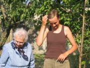 J'ai éclairci aujourd'hui et je n'aime pas choisir quelle plante est la plus belle et tirer tous les autres. En tout cas, c'est n'est pas perdu parce que on a visité Mamie et j'ai lui donné ce que j'ai enlevé. Elle était contente. En fait j'avait commencé il y a déjà quelques jours. Comme ça j'ai mis certaines plantes en pots, une tomate, une courgette "sweet dumpling", des brocolis, des choux bruxelles et un chou-rave. Malheureusement je me rappelait plus quelle pousse de chou était laquelle donc le donne est devenu une surprise aussi... Elle a aussi eu des pousses de ses fraises. Mamie m'a dit que les navets et rutabagas deviennent plus tendres plus long temps si on les repiquent donc j'ai essayé avec un navet et trois rutabagas. Comme ça les rangs sont plus beaux aussi. Quant à Mamie, j'ai replanté pas mal de persil qui pousse sauvagement partout et aujoud'hui j'ai vu que ça pousse encore parmi les tomates et les piments ça n'arrête pas. La ciboulette et le persil que j'ai semé ne se sont pas levés donc j'ai repiqué ce que Mamie a laissé sans savoir. Merci Mamie! Elle a laissé de la grosse sive aussi que j'ai mélangé avec la ciboulette. On verra que ça donne... Le paillage continu, quelques laitues sont en train de pommer, les tomates grandisent, les plantes poussent et les mauvaises herbes aussi. Biner et enlever les mauvaises herbes, j'espère que la paillage va aider contre ça. Il faut dire que je suis impressionée par les courgettes de Mamie. J'ai beaucoup à apprendre d'elle! Je sais qu'il faut pas comparer mais je le fait qaund même pour montrer comme ses courgettes sont belles!